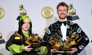 Finneas, each holding their Grammys.